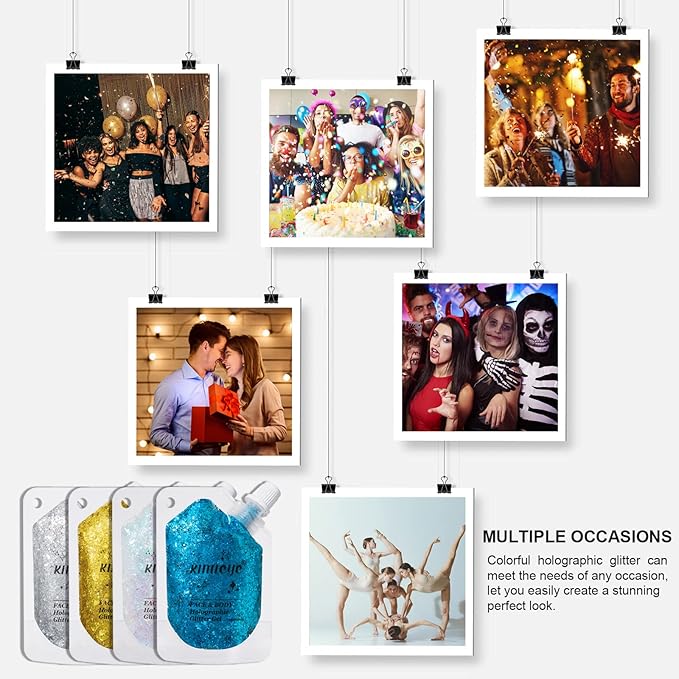 - 【MULTIPLE USES】The holographic chunky glitter gel can be used for dates, holiday parties, stage shows, bars and more. It can perfectly decorate your face, collarbones, eye shadow, lips, nail art and more. Our body glitter can make you shine as the center of attention in the crowd under the lights of a party or nightclub.