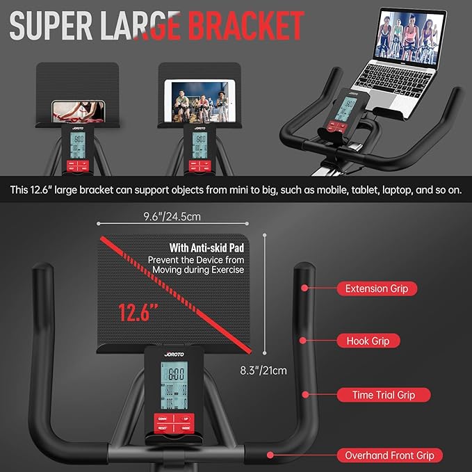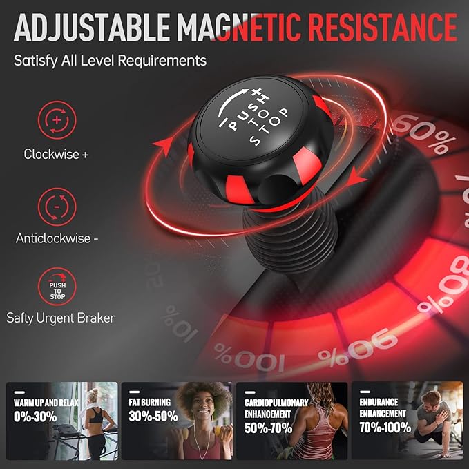 - 【Unique Updated Designs】① Unique 12.6” enlarged tablet bracket supports objects from mini to big (mobile, water bottle, books, tablets, laptops).② Unique resistance and urgent stop system: 5 stronger magnets for magnetic resistance + extra leather brake pad for safer emergency stops (no impact on normal cycling).