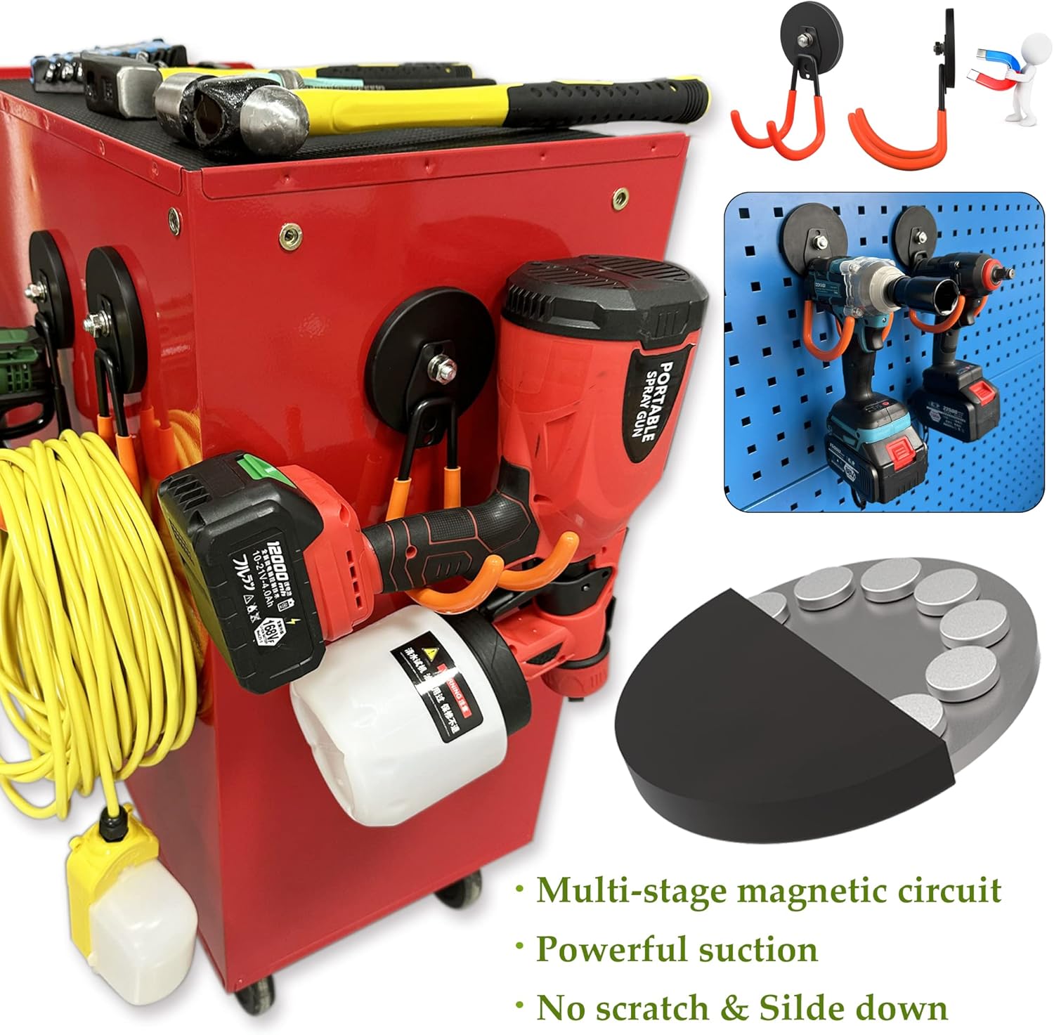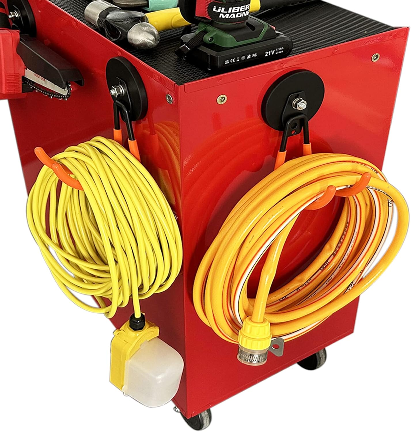 - [Heavy Duty Magnetic Hook]: Heavy duty solid steel hooks can create efficient storage space for your extension cord, cable, hose, power cord,rope,frill,jig saw,circular saw,garden lawn tools etc