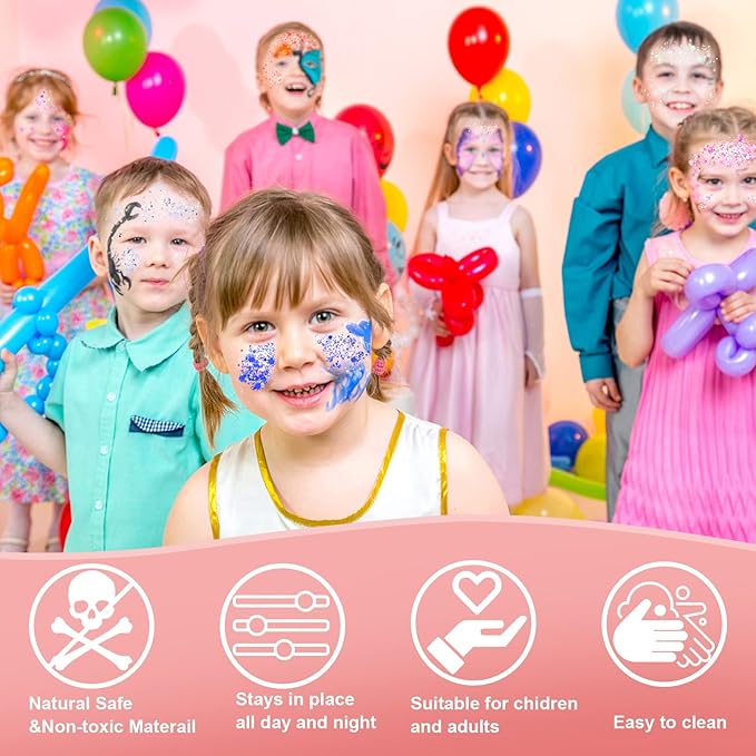 - Easy-on,easy-off:Has a stick adhesive,goes on smoothly with a quick swipe of a finger or brush after easy squeezing out.Can be applied over face paint designs or body shimmer without smearing them.For ultimate glitter effect apply in layers letting each layer dry before applying the next.Easily remove with soap and water.