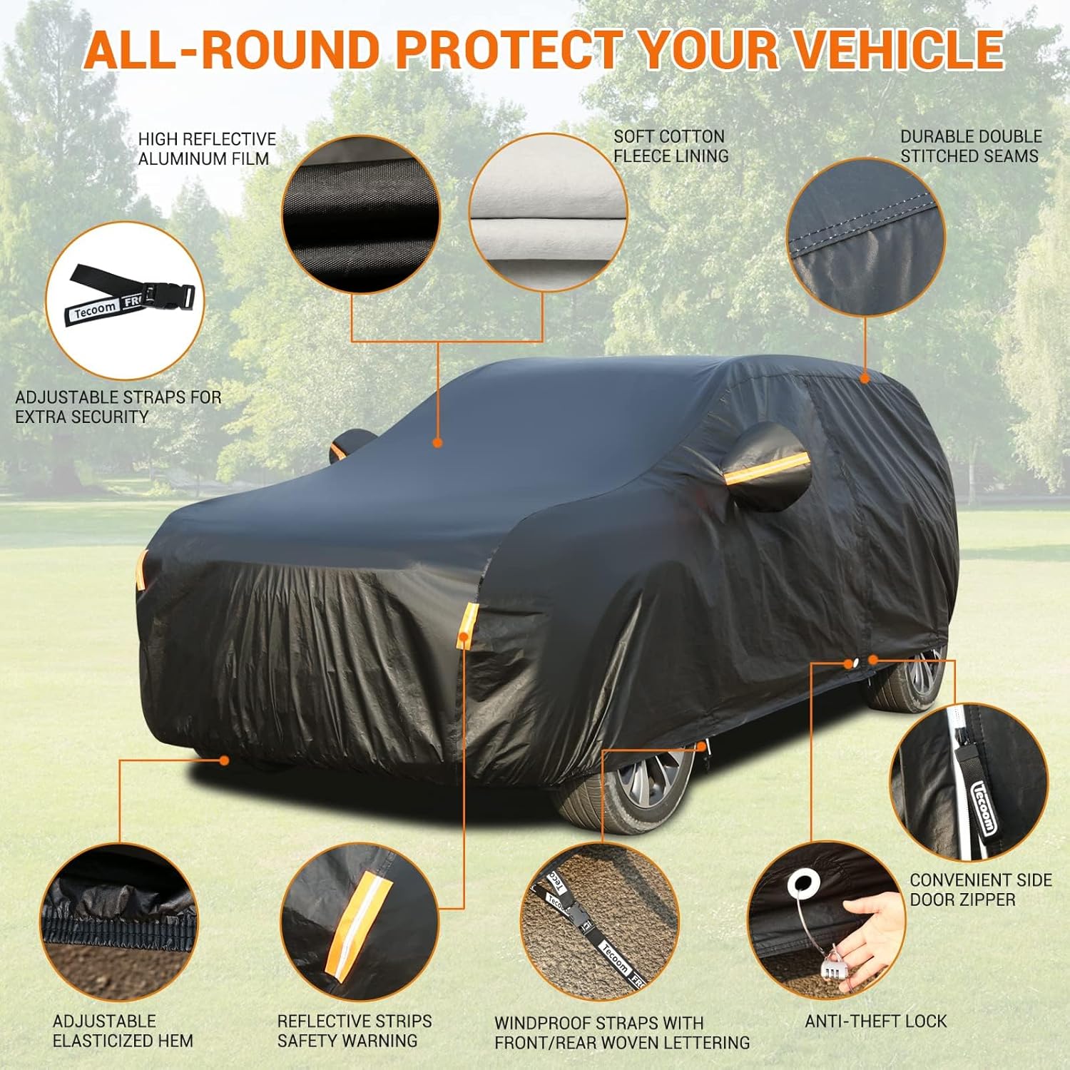 - 360°All-round Protection: Tecoom all-weather car cover is made of strong material to protect your car from sun, rain, snow, rain, frost, bird droppings, sand, dust, leaves, industrial pollution and more. Black car cover SUV is stain-resistant and easy to clean, and the breathable material improves airflow and reduces condensation while covering.