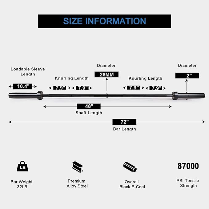 - Specifications: Full length is 72” (6ft); Weighs 32LBS; 500 pounds weight capacity; 87,000 PSI tensile strength; 28mm handgrip diameter; Single knurl mark; No center knurl. Shaft length is 48’’; Loadable sleeves are 10.4” long and 2” in diameter to fit any Olympic weight plates.
