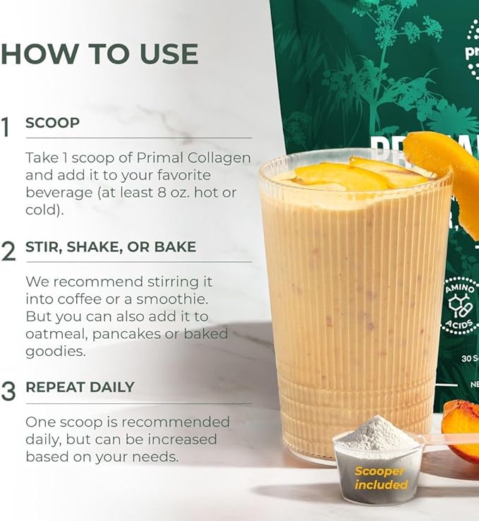 - Recommended Dosage: Stir one scoop of collagen powder into an 8oz beverage or smoothie of your choice; drink once daily & combine with balanced meals, exercise, water, & plenty of rest