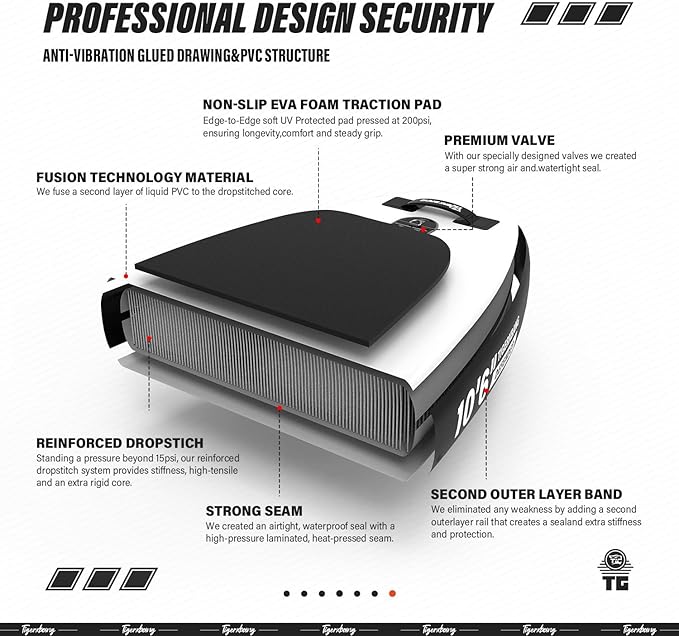 - 【Lighter and More Flexible】The TIGERXBANG Defender Collection inflatable paddle board is made of ultra-light military-grade PVC material, which has excellent wear resistance, toughness, and a long service life. With a size of 10' x 31" x 6", the paddle board is lighter, more portable, and easier to operate, allowing paddlers to navigate various complex water flow environments with more flexibility.
