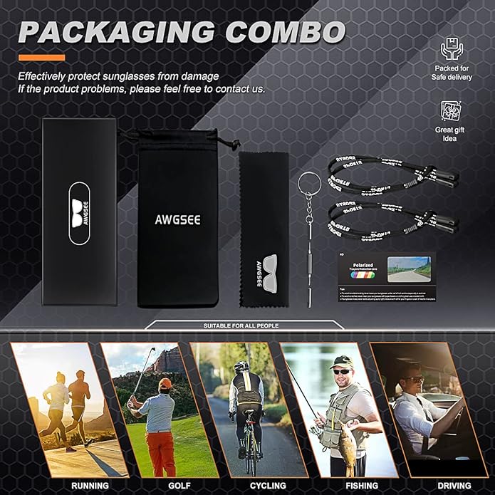• USE OCCASIONS ► AWGSEE polarized sunglasses can block 100% of UVA and UVB rays, If you’re working outdoors, especially when doing high-glare activities around water or snow or road, mens fishing sunglasses help reduce glare and provide extra clarity while keeping your eyes protected. Is ideal for usage by motorcycle and cycling, driving, running, fishing, climbing, trekking or other outdoor activity enthusiasts.