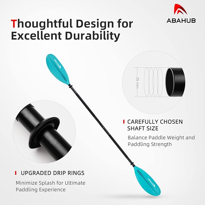 • MADE to LAST: Made of premium quality 1.15mm thick, 29mm diameter aluminum alloy shaft, and fiberglass reinforced polypropylene blades, total weighs 39oz (1100g). This kayak paddle is impact and erosion resistent, thus for great durability. It’s perfect for beginner and intermediate kayakers.