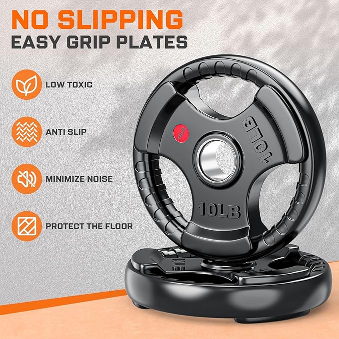 - EASY GRIP – The Olympic weight plates is designed with three holes and there are grooves in the grip holes for easy and safe handling when loading and unloading heavy objects. Descending and lowering after weight training is safer and more practical. The comfortable grip also gives you a good using experience