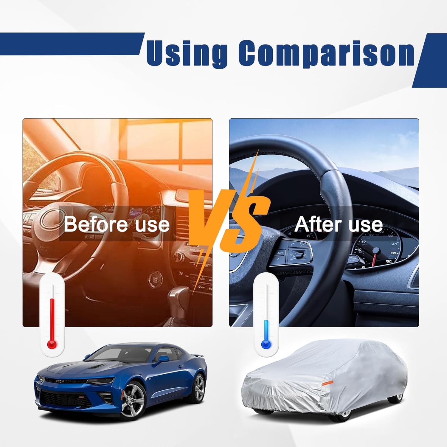 - 【Premium Material】-Kayme 6 layers car cover is made of heavy duty material. 1 PE&PEVA is 100% waterproof, It's great for rainproof snowproofing. 2 High reflective aluminum is good at sunproof and anti-uv, Keep the car cool in the summer. 3 Thicker and soft cotton will protect vehicle painting. Kayme multi-layer material is much thicker and more durable than other similar products.