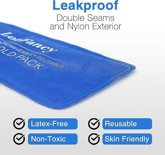 - SAFE, DURABLE & REUSABLE: Our long lasting gel packs are made from medical grade vinyl and strong nylon lining to prevent leaks for extended reusability; filled with nontoxic, eco-friendly CMC and glycerin, latex-free, safe for all ages and sensitive skin