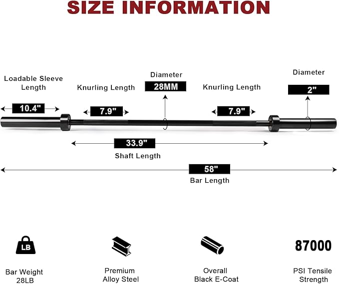 - Specifications: Full length is 58” (4.9ft); Weighs 28LBS; 500 pounds weight capacity; 87,000 PSI tensile strength; 28mm handgrip diameter; No center knurl; No knurl marks. Shaft length is 33.9’’; Loadable sleeves are 10.4” long and 2” in diameter to fit Olympic weight plates.