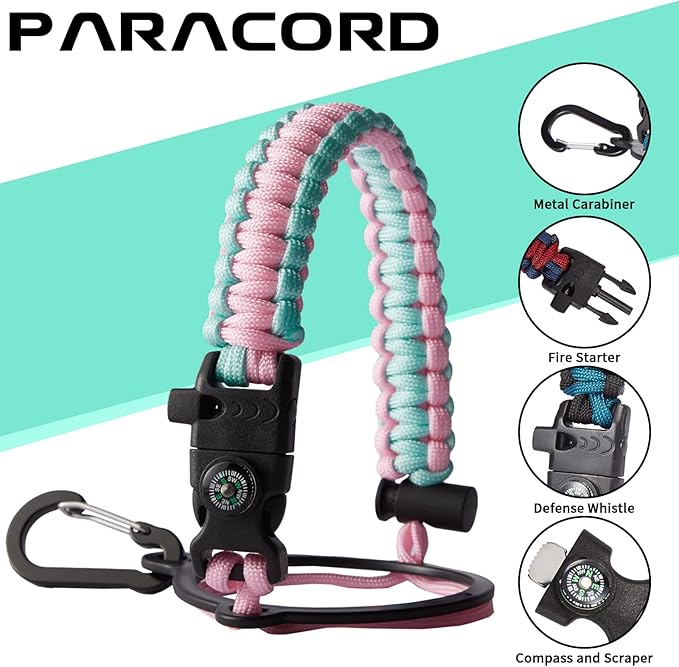 - UNIQUE PARACORD HANDLE: Bright color paracord matches the flask water bottle to give you a youthful vibe while adding a personal style. With a compass, safety loop, metal carabiner, flint, igniter and whistle to become your survival tool, making the 32 oz stainless steel water bottle with paracord an ideal survival kit for expeditions in the wild