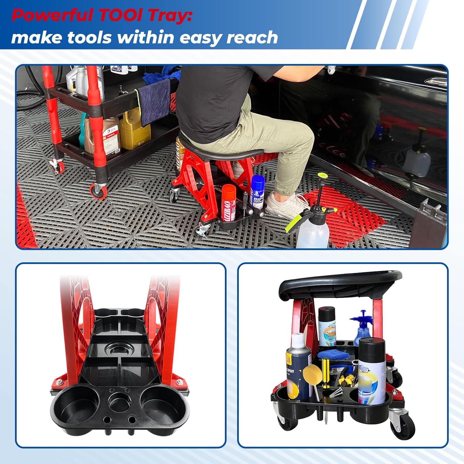 - [POWERFUL STORAGE SOLUTION]: This rolling mechanic stool with oversized tool storage tray underneath, has 4 bottle/cup/can holders, 4 compartments, screwdriver storage holes and one 4" magnetic bowl holder, can place spray bottles, cleaning supplies and so on. Easy organization and transport of tools.