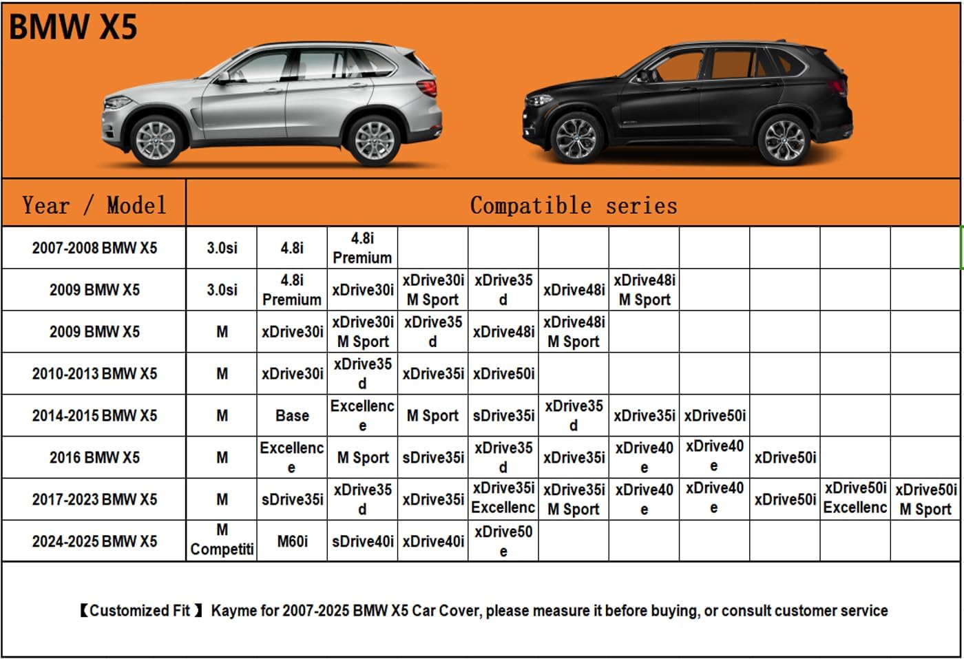 - 【Suitable for】— Custom fit for BMW X5 (2007-2025). Come with a large enough portable bag to store your cover when you do not use