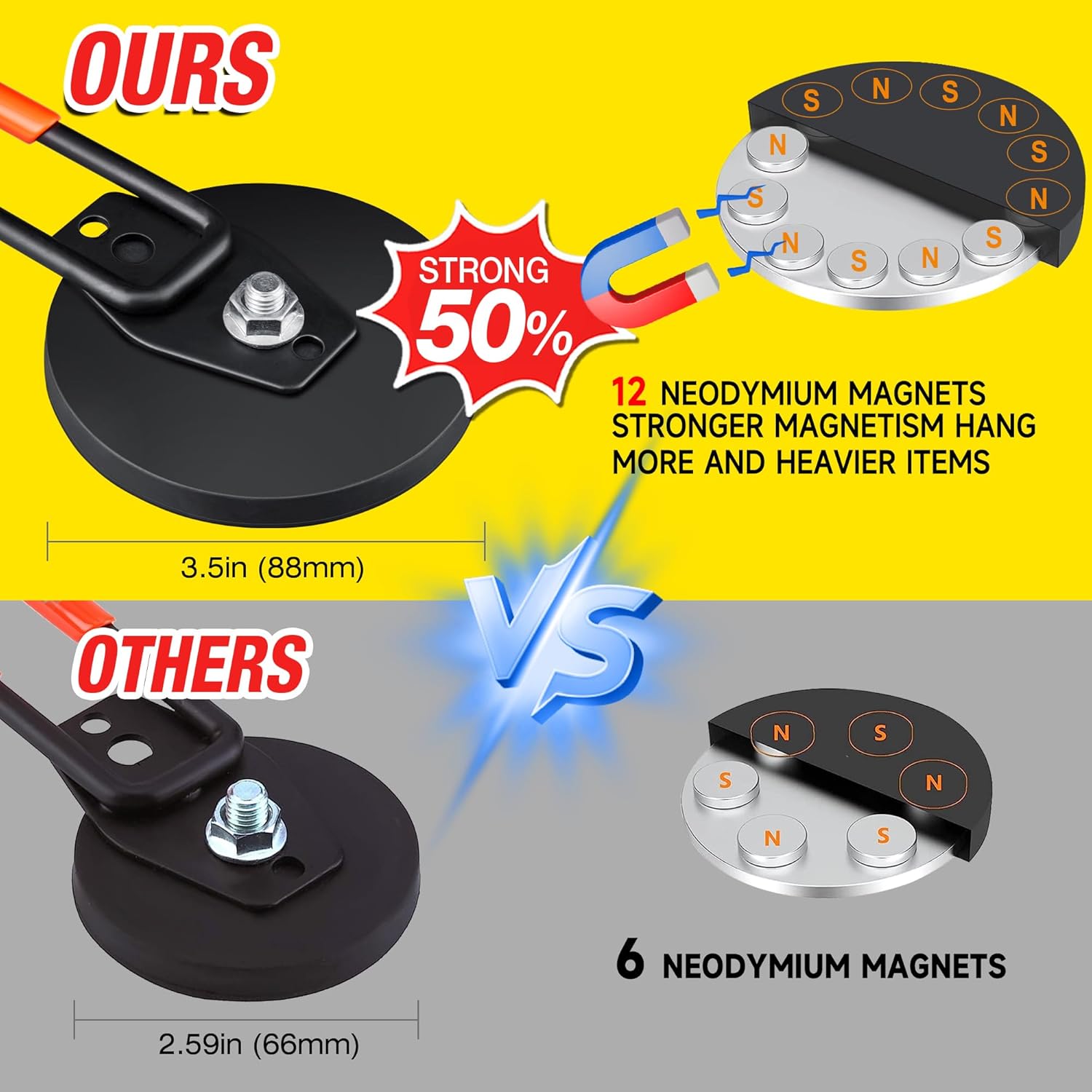 - 🧲[Super Durablel] This heavy duty magnetic holder boasts a magnetic diameter of 3.5in(88mm) and features 12 powerful neodymium magnets. The base of the magnet hook is cover with premium soft rubber, providing excellent friction and protect surface from scratches, reduce wear, and make them durable.