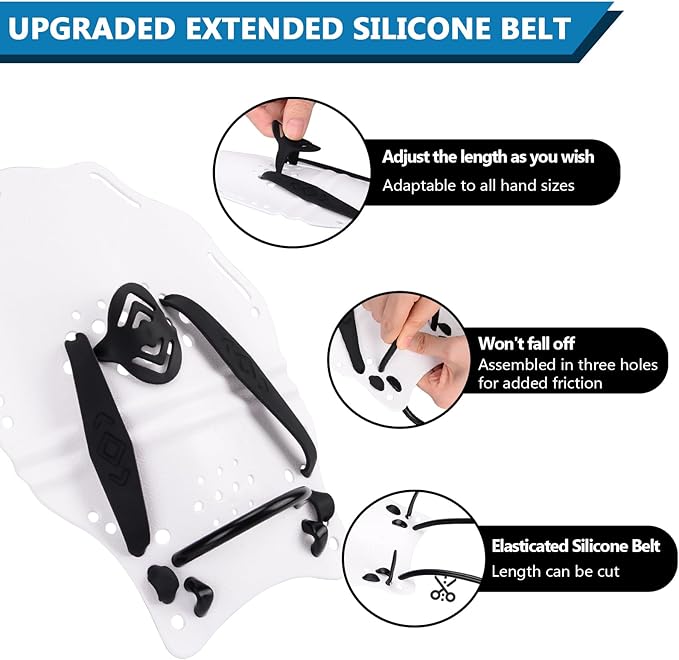 - [OPTIMISED AND IMPROVED] The updated design of the swim paddle hand have been lengthened and we are giving away 2 pairs of long and short wrist straps for you to choose from, eliminating the problem of the wrist straps falling off during swimming and greatly increasing the resistance of swimming.
