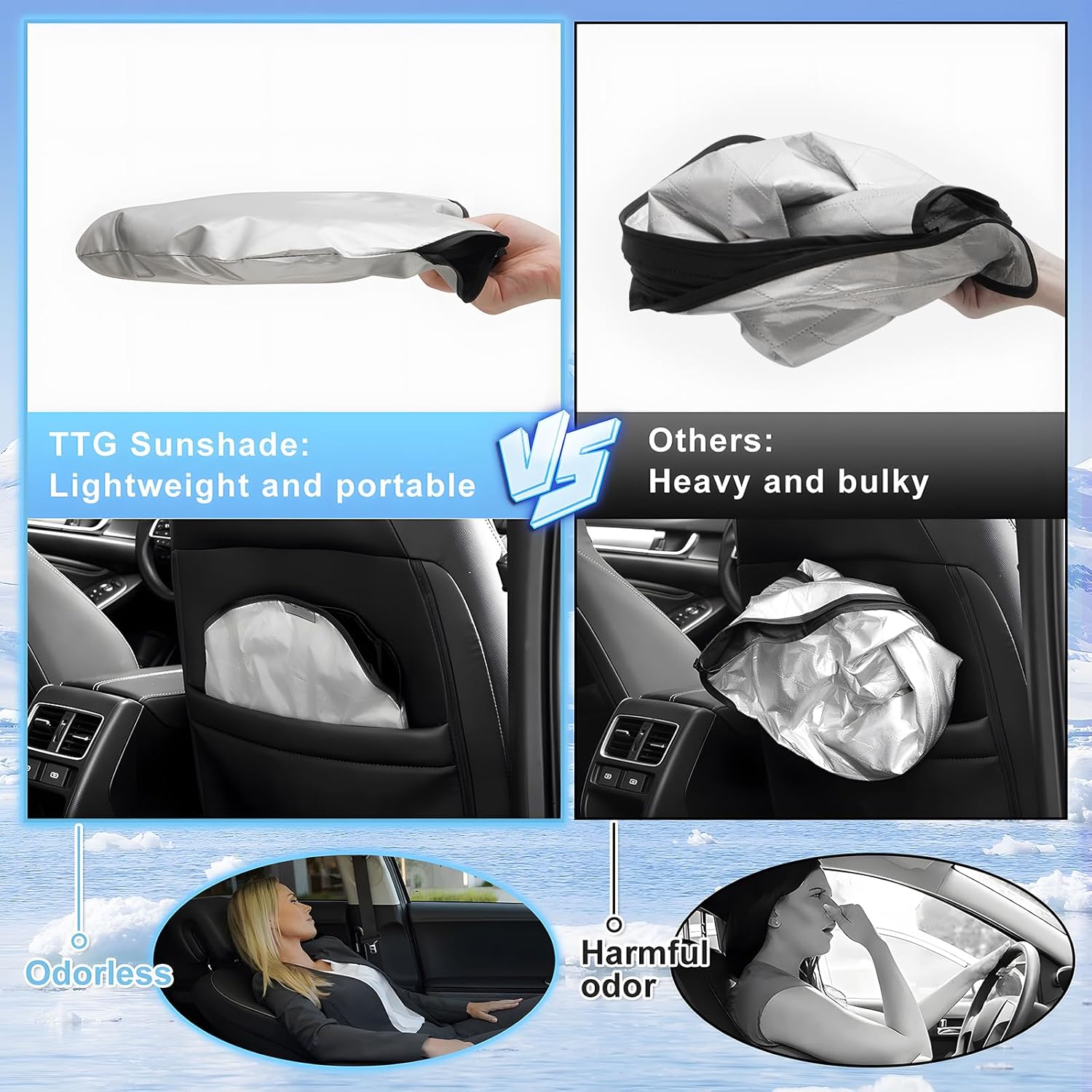 - 【Keep Your Vehicle Cool】Titanium silver glue coating design for maximum protection for your vehicle's interior,can block a lot of sunlight, reject the harmful UV Rays,and sun glare to protect your family's skin & eyes.Let your car with sunshine isolation,anti-UV protection and reduce direct sunlight caused aging interior and preventing sun heating your vehicles interior,seats,dashboard and other electronic devices.