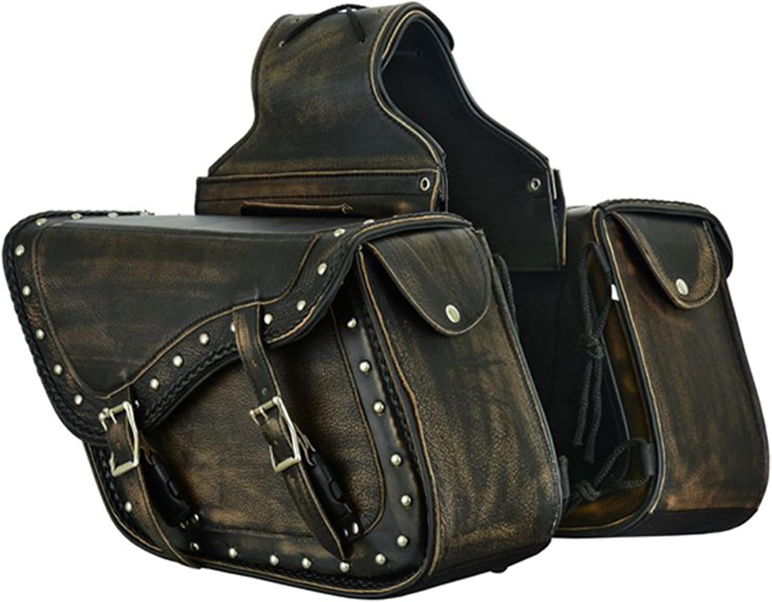 - [Fashion Appearance and Flap Design] - Thin braiding is built along edges and makes the saddlebags more fashion. The distressed brown saddle bags will give your motorcycle a new look while also greatly expand practicality of bike. Flap design and strong stitching make sure that the saddle bags will not lose luggage when riding fast on bumpy roads. Flap design helps prevent dust or rain from entering and keep items clean and dry.