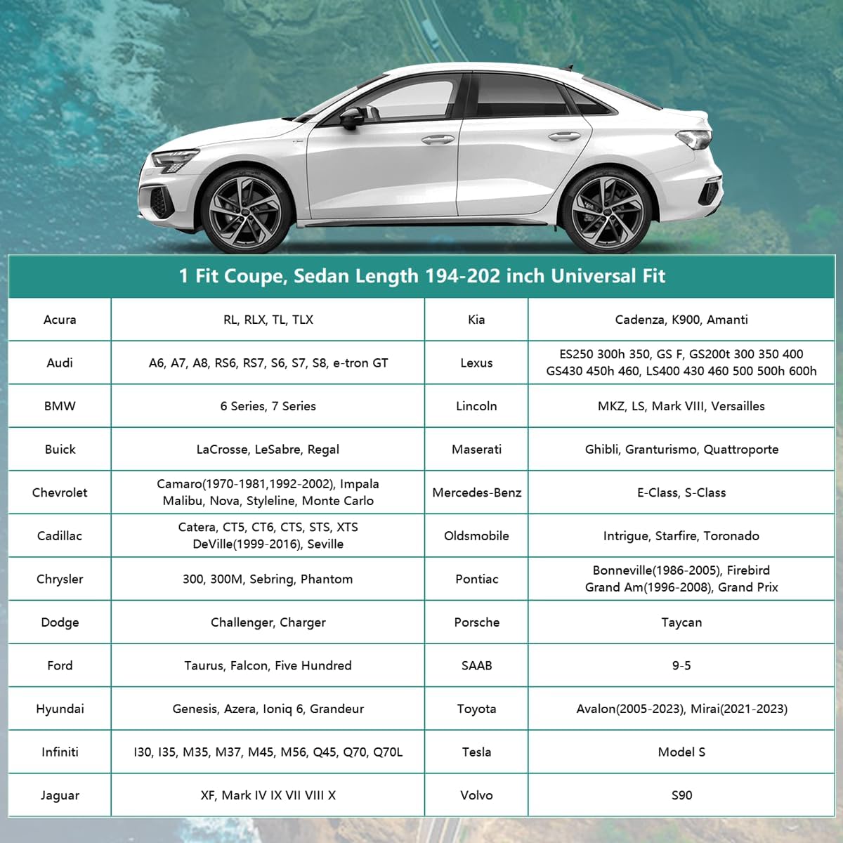 - 【Model Choice】GUNHYI automobiles cover is suitable for Coupe, Convertible, Length 194 to 202 inch (Not for SUV Hatchback). For exmaple--Dodge Challenger, Hyundai Genesis, Jaguar XF/XJ, Tesla Model S, Audi A6/S6/A7/S7, Buick Regal/Lacrosse, Cadillac Seville/CTS/XTS, Chevy Impala, Ford Taurus, BMY 5 Series/6 Series, Infiniti Q45/Q70, Lincoln MKZ, Benz S-Class/Cls-Class, Pontiac Firebird/GrandPrix, Porsche Panamera/Taycan, Toyota Avalon, Vw Phaeton, Volvo S90 etc.