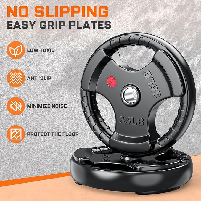 - EASY GRIP – The Olympic weight plates is designed with three holes and there are grooves in the grip holes for easy and safe handling when loading and unloading heavy objects. Descending and lowering after weight training is safer and more practical. The comfortable grip also gives you a good using experience