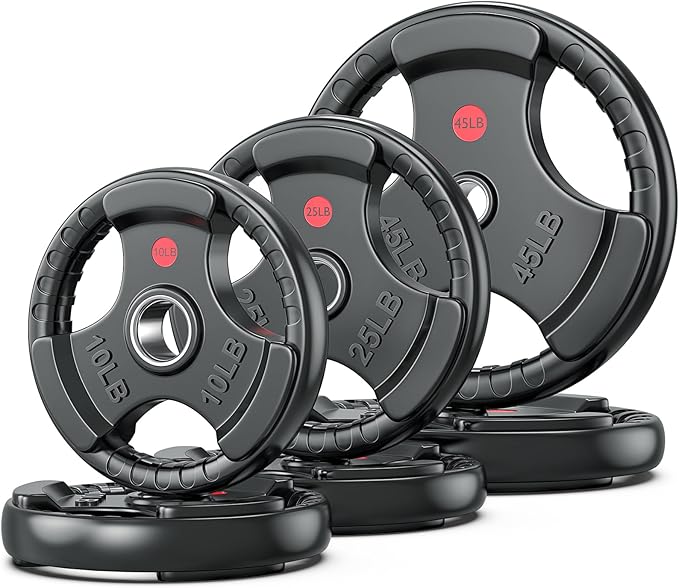 - EASY GRIP – The Olympic weight plates is designed with three holes and there are grooves in the grip holes for easy and safe handling when loading and unloading heavy objects. Descending and lowering after weight training is safer and more practical. The comfortable grip also gives you a good using experience