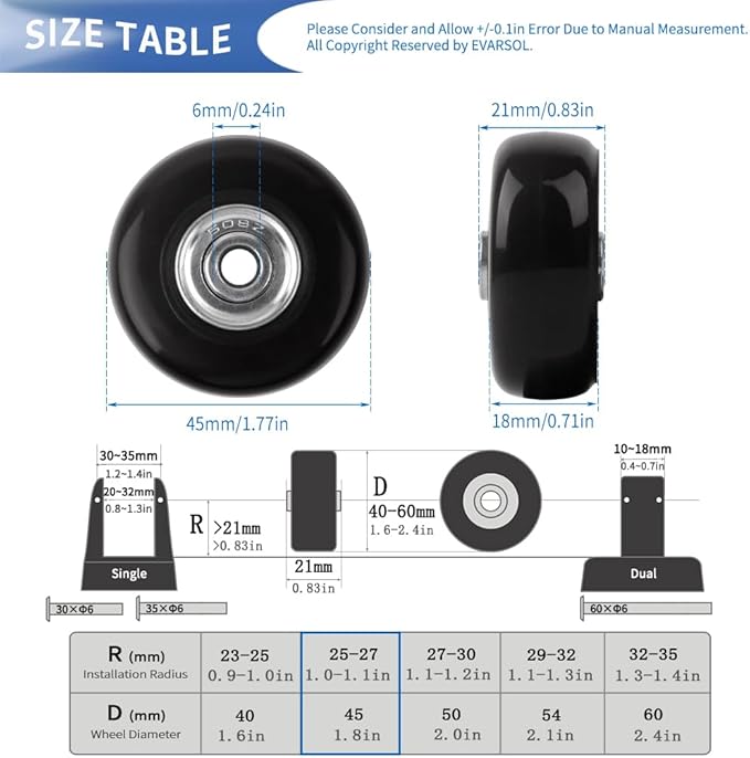 - Widely applications:Fix for most luggage suitcase/trolley case/duffle bag/drawbar box with damaged/jammed/rubber worn wheel replacement repair,but also for replacing inline roller skate wheels
