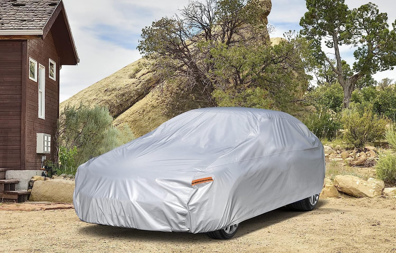 - 【Premium Material】-Kayme 6 layers car cover is made of heavy duty material. 1 PE&PEVA is 100% waterproof, It's great for rainproof snowproofing. 2 High reflective aluminum is good at sunproof and anti-uv, Keep the car cool in the summer. 3 Thicker and soft cotton will protect vehicle painting. Kayme multi-layer material is much thicker and more durable than other similar products.