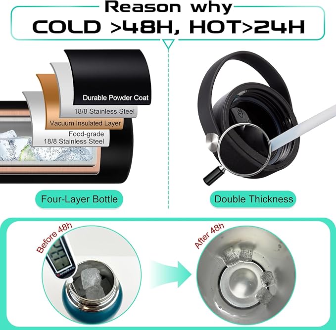 - TRIPLE-INSULATION & HIGH-PERFORMANCE: This wide mouth 2/3 gallon water bottle features triple-wall vacuum insulation and pro-grade stainless steel, it keep-cold for 48 hrs and keep-warm for 24 hrs without altering the taste and keeps your water tasting fresh. Using this metal water bottle on hot summer days or your next camping trip to stay hydrated all the day