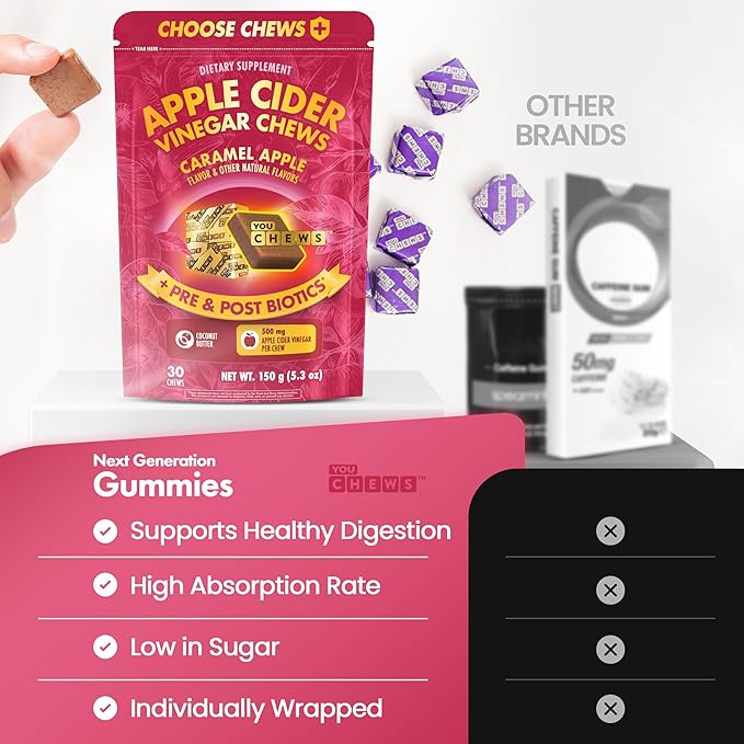 - Better Than Apple Cider Vinegar Pills or Gummies Easier to Digest, No Sticky Mess Unlike sticky gummies or hard-to-swallow capsules, YouChews soft chews are gentle on your stomach, quick to absorb, and won’t melt or clump, giving you all the benefits without the hassle."