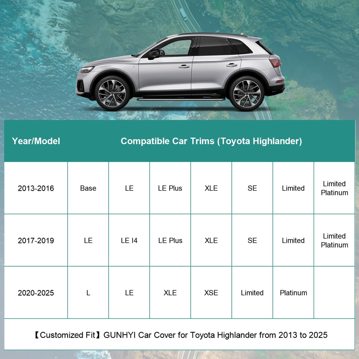 - 【Compatible with】This Full Car Cover Custom fit for Toyota Highlander from 2013 to 2025. Comes with a microfiber towel that you can use to clean your car, because if there is sand on the surface of the car before use, it may damage the paint.