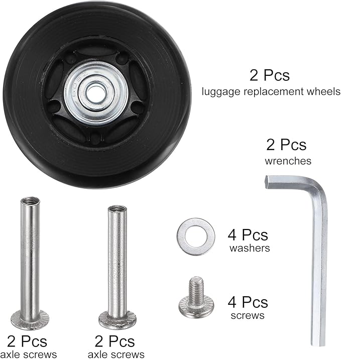 - Luggage Suitcase Replacement Wheels Set: You will get 2 luggage replacement wheels, 2 wrenches, 4 axle screws, 4 screws, and 4 washers, a full set means you have everything you need for a successful wheel replacement.