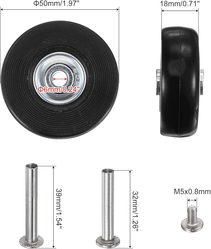 - Reasonable Size: Each luggage wheel measures 50mm/1.97" in outside diameter, the inner diameter is about 6mm/0.24", and the depth is 18mm/0.71". The screw size is M5x0.8mm.