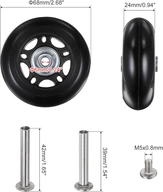 - Reasonable Size: Each luggage wheel measures 68mm/2.68" in outside diameter, the inner diameter is about 6mm/0.24", and the depth is 24mm/0.94". The screw size is M5x0.8mm.