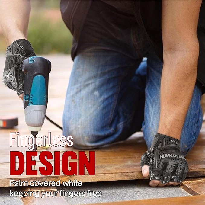 HANDLANDY Fingerless Work Gloves for Men, Padded Half Finger Tactical Mechanics Gloves, Utility Trucker Driver Gloves (Black, Large (Pack of 1))