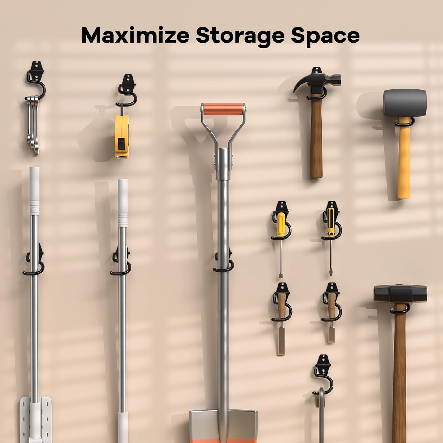 - 【Versatile】These hooks are perfect for saving space and maximizing storage in your home, apartment, garage, basement, or tool shop. They are versatile and reusable, making them ideal for holding garden tools, hoses, power tools, shovels, brooms, or bulk items.