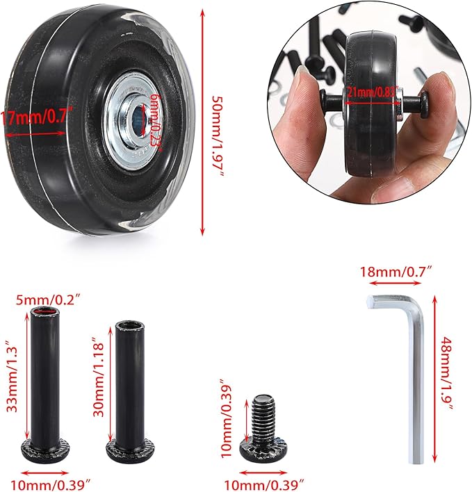 - PLEASE Confirm the size of this luggage wheel on our pictures before purchasing!! Diameter of this luggage wheel is 50mm / 1.97", Rim Width is 17mm / 0.7", Total Wheel Width is 21mm / 0.83" and Center Bearing internal diameter is 6mm / 0.23".