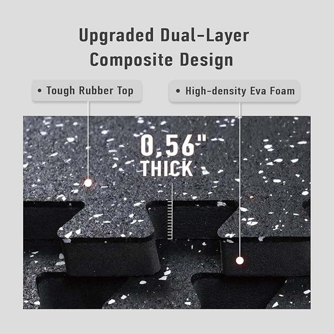 - [Upgraded Dual-Layer Design]: Concerned about your equipment scratching the floor during workouts? Our 2in1 Rubber Top EVA Foam Exercise Gym Mats are crafted to solve this issue. The textured rubber top layer, combined with a high-density EVA foam bottom layer, seamlessly creates a non-slip tough surface with excellent shock absorption.