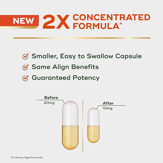 - NEW 2X CONCENTRATED FORMULA: Our new formula uses 2x concentrated probiotic material. This allows for the same CFU count and the same benefits you love from Align in a smaller, easy to swallow capsule. (Vs Previous Align Pro Formula)