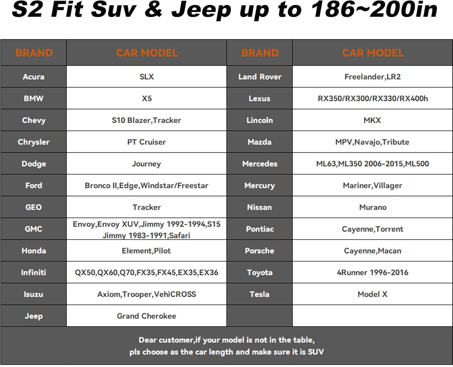 - Choose the right size - This suv cover waterproof all weather measures 200" L X 78" W X 70" H.See the product images for applicable vehicle models.Please check the car details before you order the auto cover. 1.Check your car model:Sedan or SUV?2.Measure your car length.We offer one-year warranty,If you are not sure which size to choose or have any questions on our item, feel free to contact us.