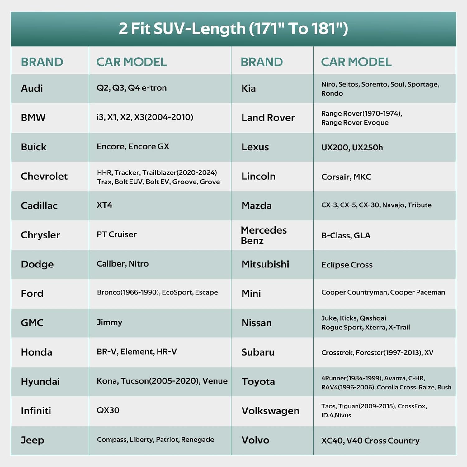 - 【CHOOSE THE RIGHT MODEL】: Molebt car cover fits SUV/Jeep Length: 171"-181". For example Ford Escape, Subaru CrossTrek/XV/Forester, Hyundai Tucson, Honda Element/HRV, Kia Soul/Sportage, Jeep Renegade, Lincoln MKC, Buick Encore, Mazda CX-30, Infiniti QX30, Toyota CHR etc.