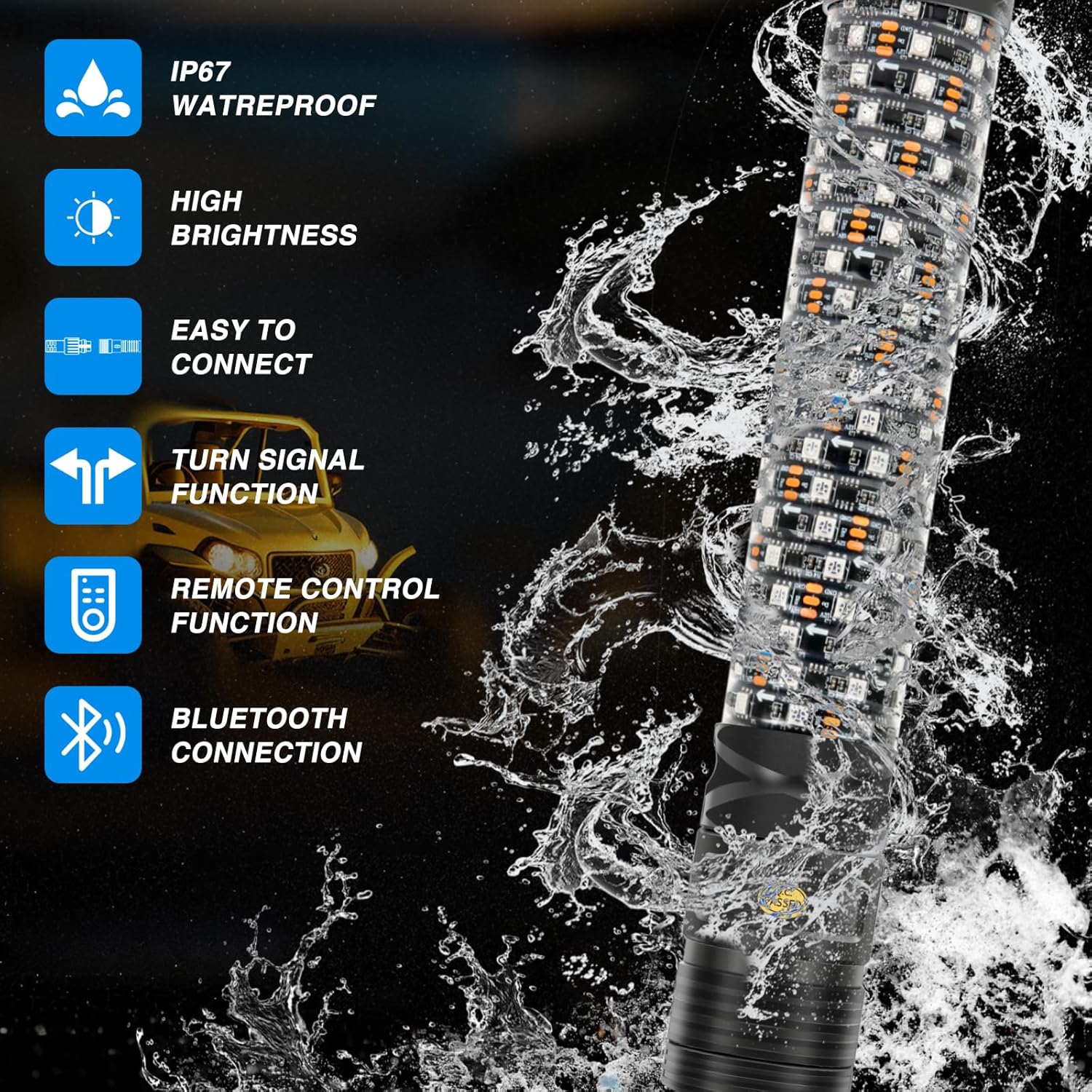 - 【RGB Chasing Light&Turn Signal】 There are 471 chips on each whip, providing 360-degree spiral lighting, they also come with additional red parking/brake lights, amber turn signal lights and white backup lights, providing extra for your ATV, UTV security. Each whip has 300 different colors, 32 levels of brightness, 10 flash speeds and 200 different modes such as strobe, fade, rainbow, swirl, chase and more.