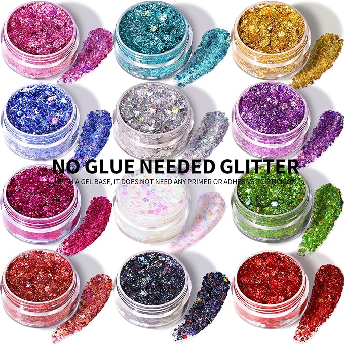 - 12 COLORS SPARKLY BODY GLITTER - 12 colors(12 jar) face and body glitter gel contains a mix of tiny stars, shimmery dust, hex’s, large chunky glitter pieces and hologram sparkle, creating a stunning sparkle effect. The body glitter gels are available in 10 gram/color, Total 120 grams in a set, providing you with plenty of colors and product to create your desired look