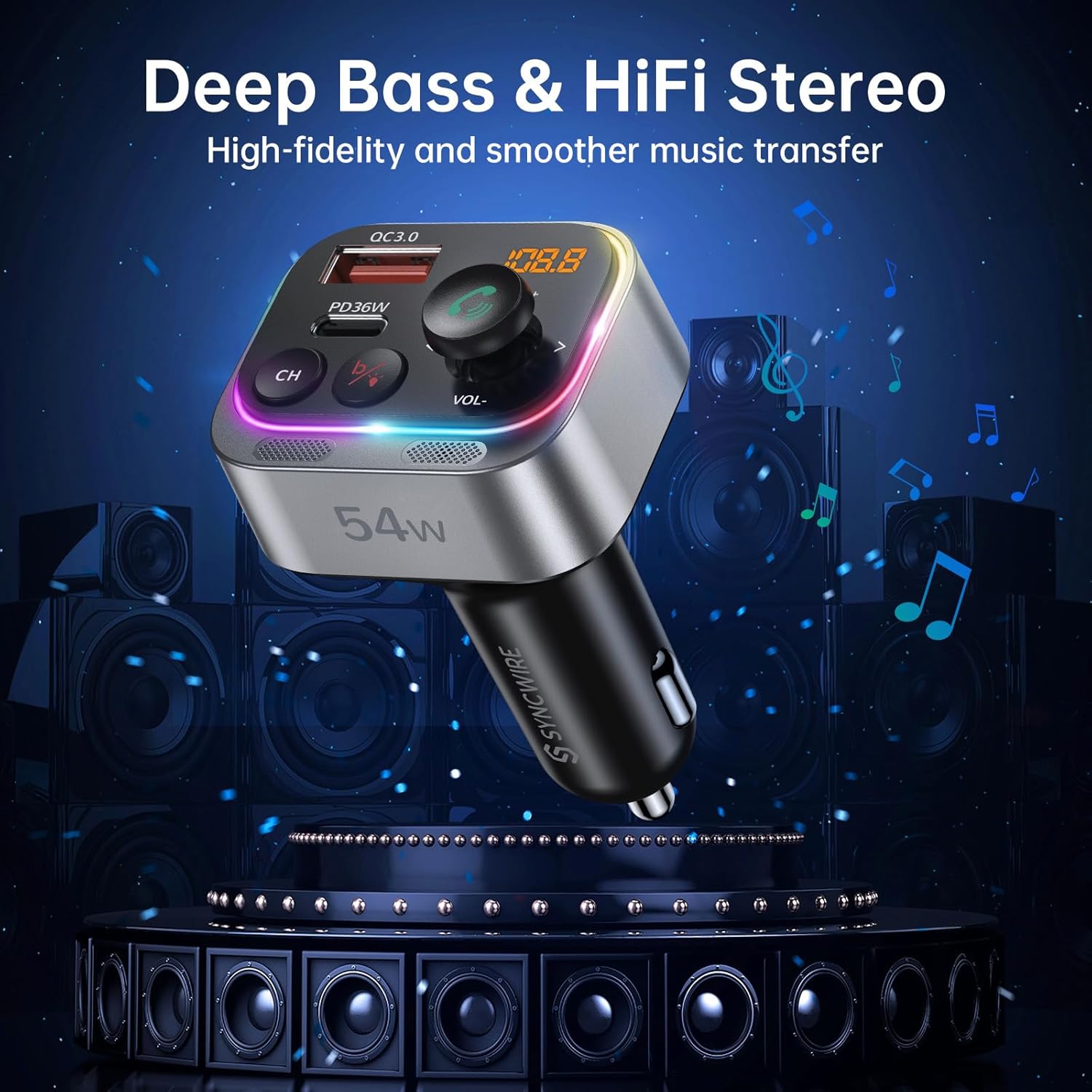 - 【Safe Efficient Charging up to 54W】The Syncwire FM transmitter Bluetooth features a PD 36W and QC3.0 18W USB charging port, delivering 4X faster charging than others and supporting simultaneous charging for two devices. Our intelligent safety features guarantee protection against overcharging, voltage spikes, overheating, and short circuits, ensuring efficient and secure charging for your devices. Note: the QC3.0 port supports fast charging only and does not support USB drives.