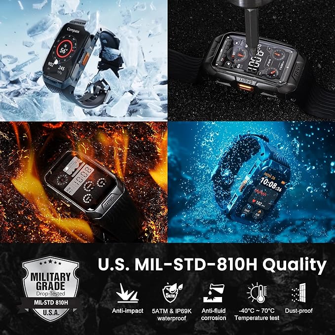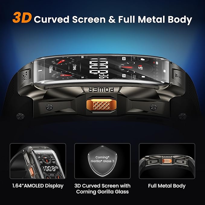 - Military-Grade Designed: The KOSPET X2 smartwatch features 1.64-inch 3rd AMOLED always-on Display with 3D curved glass, which is thick enough to handle a range of screen-breaking behaviors. The rugged smart watch has a fully stainless steel unibody, passed 15 Military Tests(MIL-STD-810H) and 28 Reliable Internal Tests, Including salt spray, rain, impact, etc.