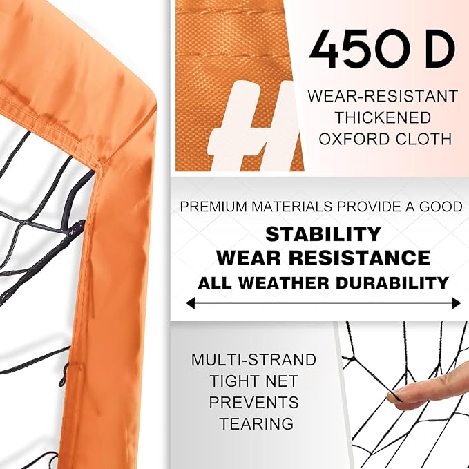 - 【Long-lasting Thickened Material】 The soccer goal is made of 450D thickened oxford cloth, 10mm high elastic fiberglass pole and strong 3-layer polyester soccer net. This ensures exceptional performance even against powerful shots, maintaining its all-weather durability and it won't fade or wear even if it is placed outdoor for a long time.