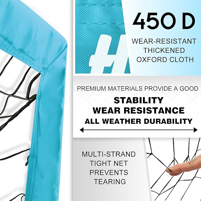 - 【Long-lasting Thickened Material】 The soccer goal is made of 450D thickened oxford cloth, 10mm high elastic fiberglass pole and strong 3-layer polyester soccer net. This ensures exceptional performance even against powerful shots, maintaining its all-weather durability and it won't fade or wear even if it is placed outdoor for a long time.
