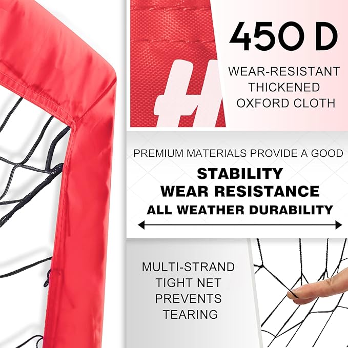 - 【Long-lasting Thickened Material】 The soccer goal is made of 450D thickened oxford cloth, 12mm high elastic fiberglass pole and strong 3-layer polyester soccer net. This ensures exceptional performance even against powerful shots, maintaining its all-weather durability and it won't fade or wear even if it is placed outdoor for a long time.