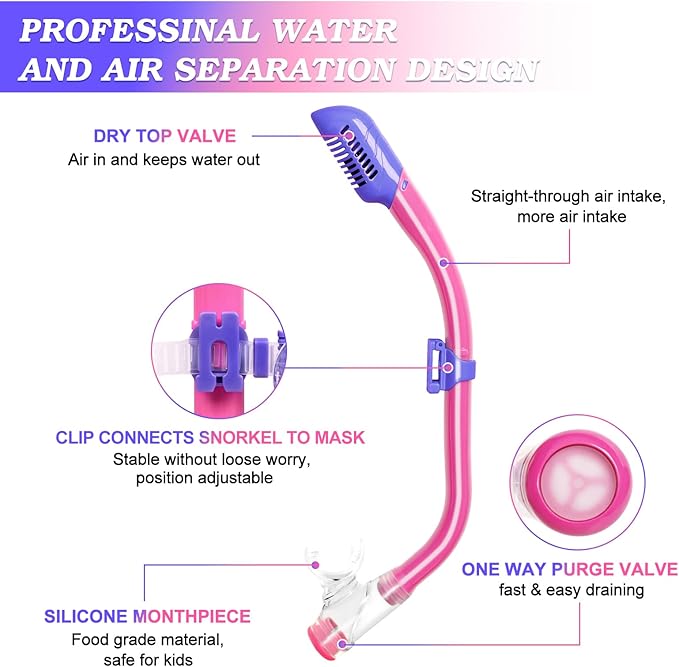 - 【DRY TOP SNORKEL & PURGE VALVE】The Snorkel adopts the most stable dry float valve design. When immersed in water, the top float valve will close automatically to prevent water from entering the breathing tube, the lower purge valve can quickly drain water, so that children will not be choked by water. Food grade soft liquid silicone mouthpiece is durable and safe for children to use.
