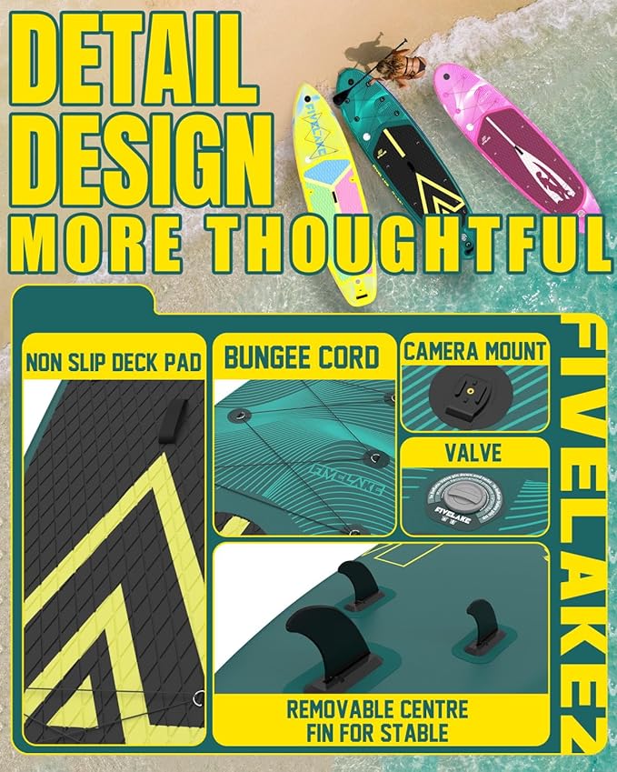 - Non-Slip Comfort Deck:Built with premium, ultra-light double-ply PVC and advanced drop-stitch core, this board offers superior strength and durability. The EVA deck's textured grooves provide excellent slip resistance and comfortable foot grip
