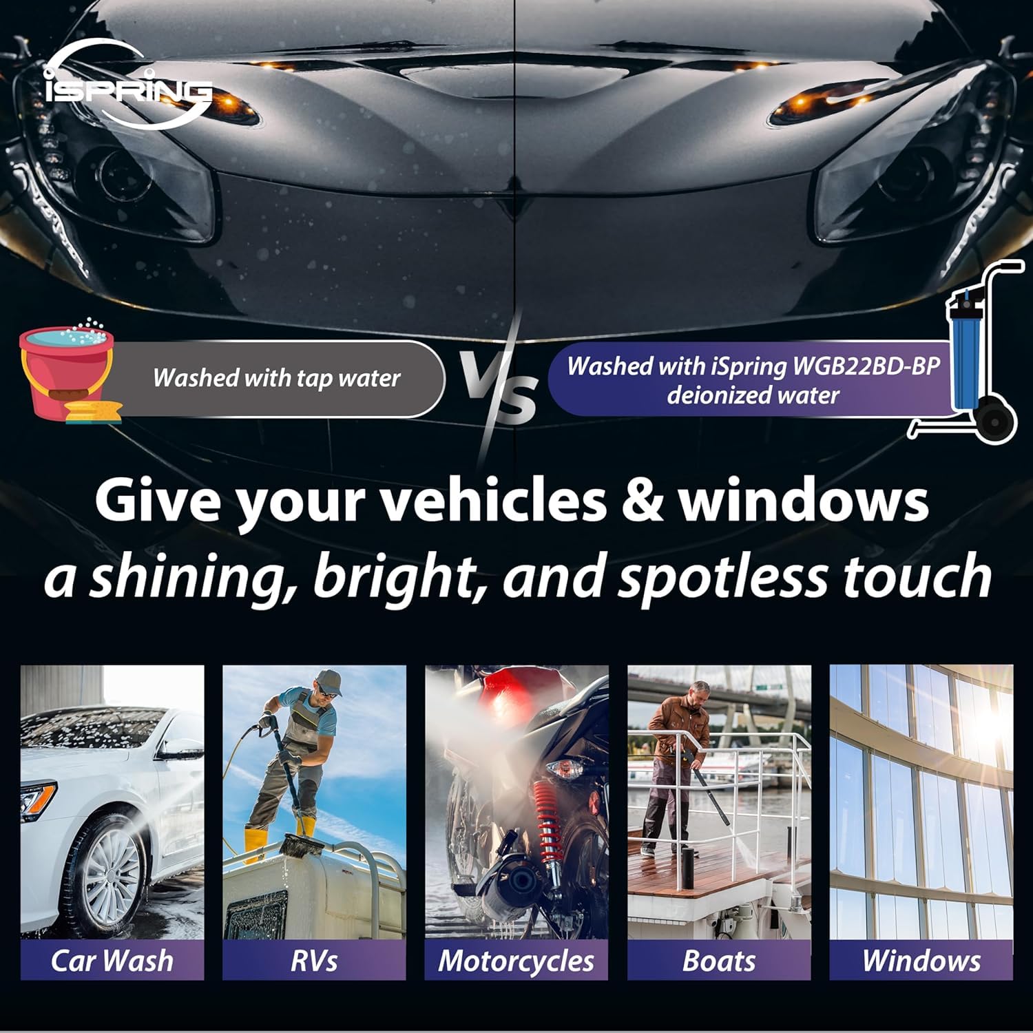 - 🚗 Advanced Car Wash Solution: Experience a pristine car wash system that delivers filtered water with minimal to zero Total Dissolved Solids (TDS). The iSpring new WGB22BD-BP deionized water system is ideal for giving cars, RVs, boats, motorcycles, windows, and more a brilliant, spotless finish.