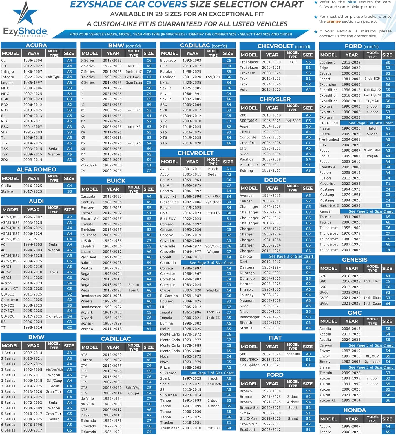 - EXTENDED WARRANTY. VIP SERVICE. EzyShade customers have long benefited from generous product warranties and industry-leading customer service. All EzyShade products with a Vehicle Size Chart (truck covers included) even come with a Great Fit Guarantee!